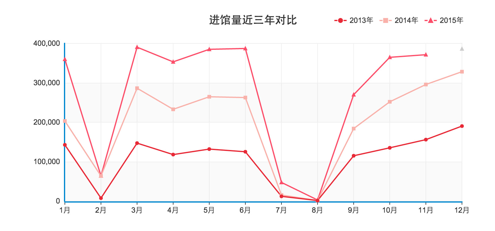 趨勢統計重點(diǎn)表現資源庫訪(fǎng)問(wèn)量隨時(shí)間周期的趨勢走勢,目前分為三種統計圖表:?jiǎn)螏熠厔輬D、分類(lèi)趨勢圖和總量趨勢圖。