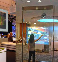 此空間采用新納米觸摸膜技術(shù)、投影成像技術(shù)進(jìn)行實(shí)現,營(yíng)造一個(gè)科幻的夢(mèng)幻般效果,讓讀者和師生能夠體驗全新的新媒體展現技術(shù)多帶來(lái)的魅力。同時(shí),納米觸摸膜是一種新型、透明的觸摸感應膜,將該膜貼在玻璃櫥窗、玻璃墻內部,就可以把玻璃櫥窗/墻改造成大尺寸觸摸屏,納米觸摸膜是應用納米材料、印刷電路、集成芯片、軟件等技術(shù)生產(chǎn)的防靜電全透明納米觸摸膜,能夠實(shí)現鼠標的所有動(dòng)作及手勢操作、實(shí)現多點(diǎn)觸摸,是人機交互方法的革命性變革。而采用此設備的配備能夠充分的利用圖書(shū)館空間,營(yíng)造環(huán)境氣氛,同時(shí)又能達到夢(mèng)幻般效果。